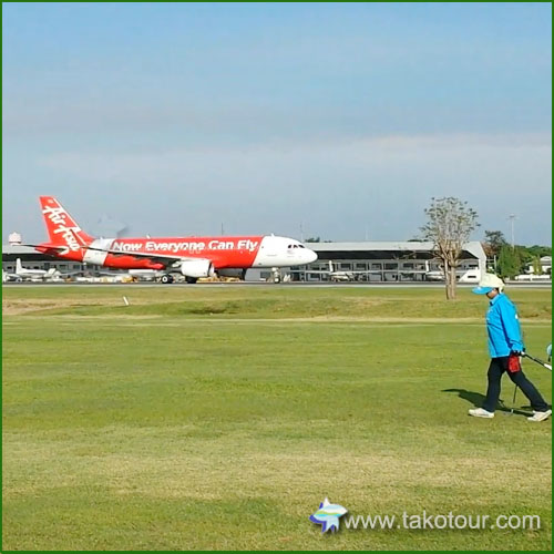ホールの左右にはドンムアンの滑走路が走っており、数分おきに大きいのから小さいのまで飛行機が離着陸を繰り返しております。その姿は圧巻です。こんなゴルフ場があるのはタイしかないと思います。コース内には移動中にホールとホールの間で滑走路を横切るシーンもあります。