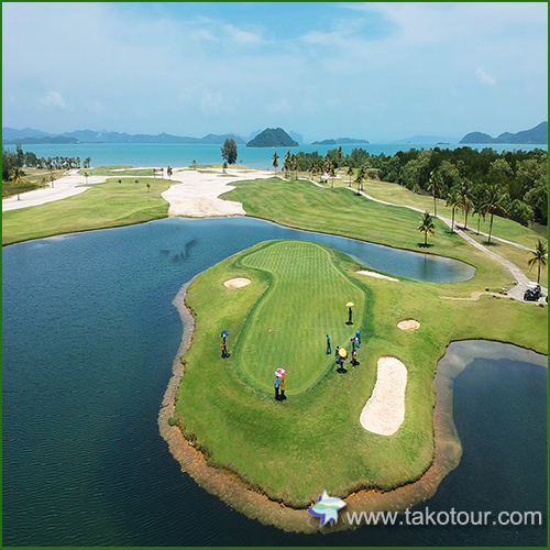 ミッションヒルズプーケットゴルフは、ジャック・ニクラウスの設計でプーケット島の風光明媚な北東部の海岸沿いにありますが、決してリンクスコースではありません。ゴム園を切り開き造成された広大な敷地に展開する18ホール、その内7ホールに水が関わってきます。一番の特徴は18ホールでフィニッシュを選択できる2つのグリーンが用意されているという際立った特徴がみられます。特に2番・パー5と、5番、パー4は一つの島が共通のグリーンになっているグリーン島となっています。フェアウェイとグリーンに、塩分に強いパスアラム芝の新種であるシーアイル芝を使用し眼にも鮮やかな彩りを添えプレイヤーの心を癒し、塩分の多い土壌にも見事に育っています。